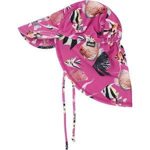 Zonnehoed met een UV berscherming van 50+, een brede rand en langer achter in de nek om het kind te beschermen in de zon. De hoed is fuschsia met een vissenprint. Dit Molo-product is gerecycled en gemaakt van recyclebaar REPREVE polyester. REPREVE is het leidende en meest erkende materiaal in recyclebare vezels en wordt geproduceerd uit gebruikte plastic flessen en ander restafval De productie van gerecycled polyester vereist veel minder grondstoffen en stoot minder CO2 uit, daarom is Molo's gerecyclede zwemkleding de duurzame keuze.