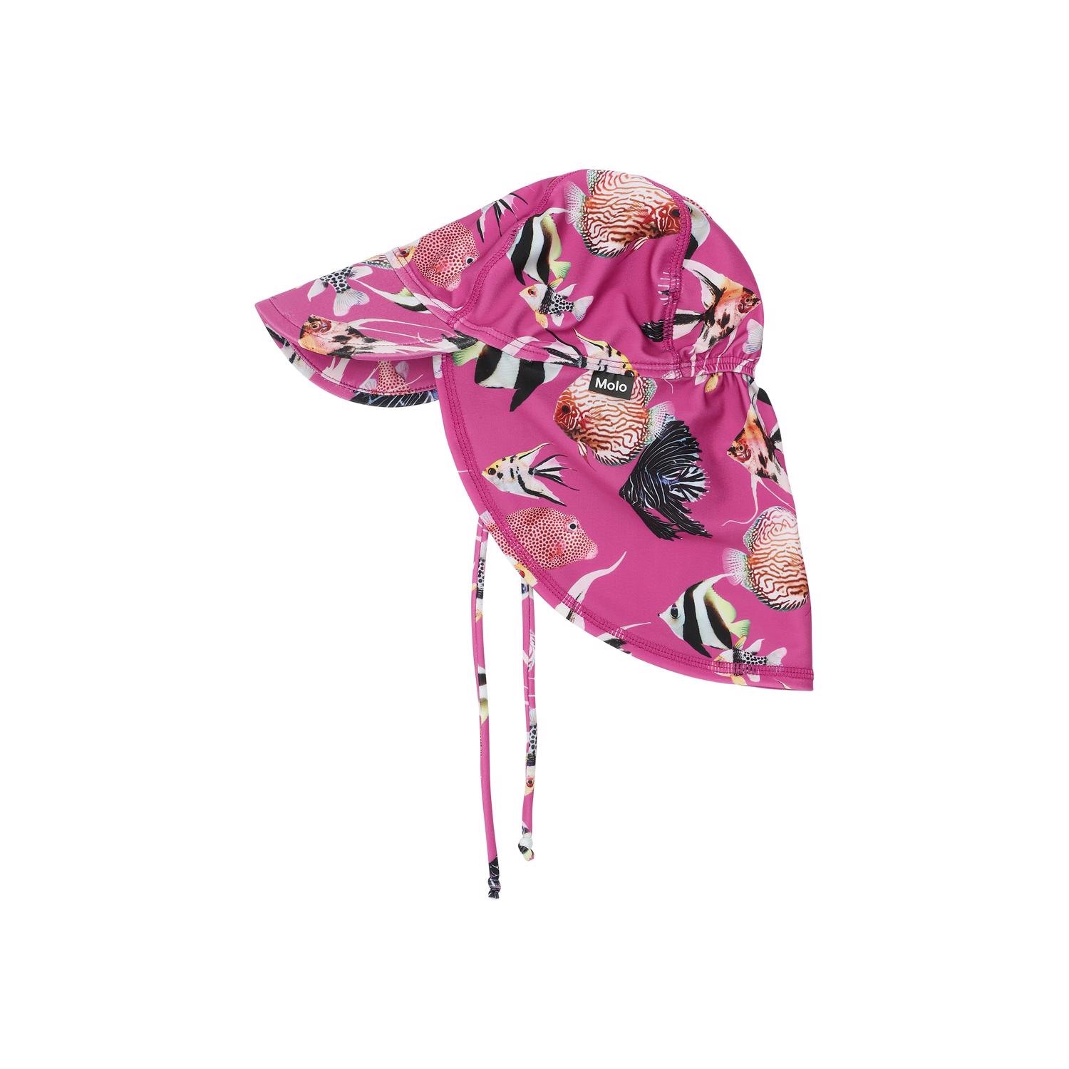 Zonnehoed met een UV berscherming van 50+, een brede rand en langer achter in de nek om het kind te beschermen in de zon. De hoed is fuschsia met een vissenprint. Dit Molo-product is gerecycled en gemaakt van recyclebaar REPREVE polyester. REPREVE is het leidende en meest erkende materiaal in recyclebare vezels en wordt geproduceerd uit gebruikte plastic flessen en ander restafval De productie van gerecycled polyester vereist veel minder grondstoffen en stoot minder CO2 uit, daarom is Molo's gerecyclede zwemkleding de duurzame keuze.