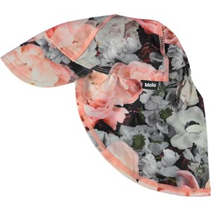 Zonnehoed met UV protection van 50+. Het heeft een brede rand en is langer aan de achterkant voor extra bescherming. De hoed is versierd met een bloemenprint.