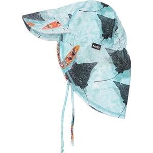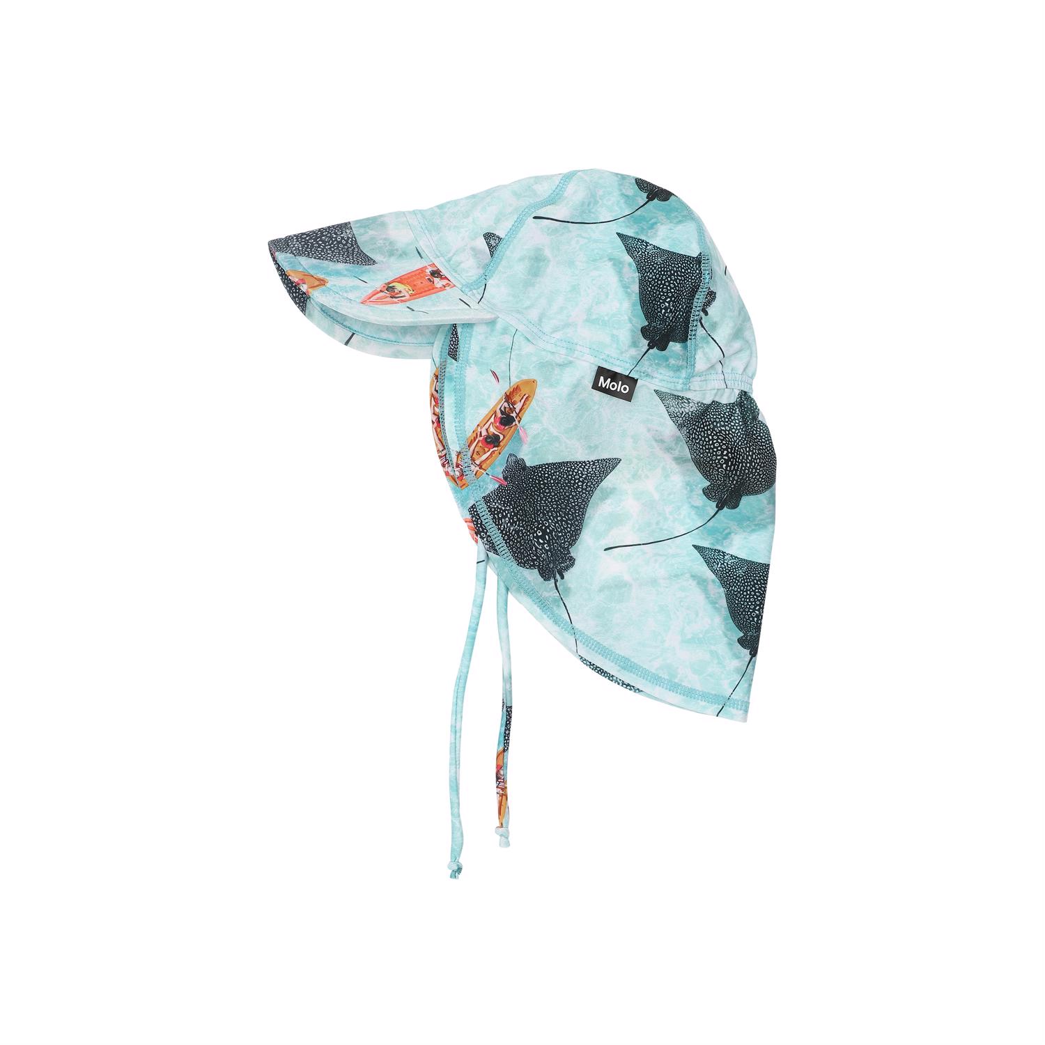 Zonnehoed met een UV berscherming van 50+, een brede rand en langer achter in de nek om het kind te beschermen in de zon. De hoed is lichtblauw met een print van pijlstaartroggen in de oceaan. Dit Molo-product is gerecycled en gemaakt van recyclebaar REPREVE polyester. REPREVE is het leidende en meest erkende materiaal in recyclebare vezels en wordt geproduceerd uit gebruikte plastic flessen en ander restafval De productie van gerecycled polyester vereist veel minder grondstoffen en stoot minder CO2 uit, daarom is Molo's gerecyclede zwemkleding de duurzame keuze.