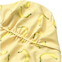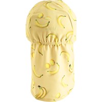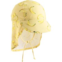 Elastische zonnehoed in geel met bananenprint voor de kleintjes, gemaakt van gerecycled polyester met UV-bescherming 50+. De hoed heeft een normale pasvorm met elastiek aan de achterkant en een smalle, flexibele kinband die ervoor zorgt dat hij op zijn plaats blijft. Een stevige rand aan de voorkant en een langere rand aan de achterkant bieden effectieve bescherming tegen de zon.