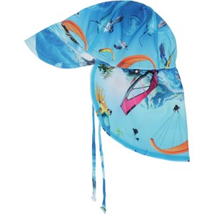 Zonnehoed met 50+ UV bescherming, een brede rand en langer aan de achterkant om het kind optimaal te beschermen. De zonnehoed is lichtblauwe met een print van verschillende sporten en dieren.