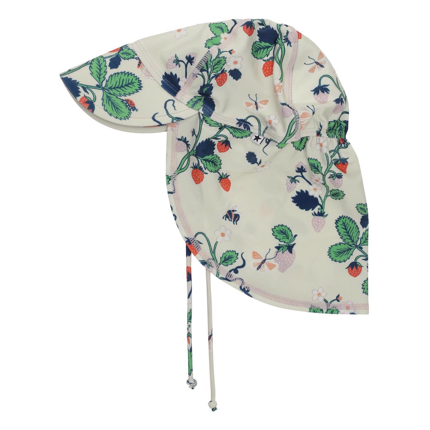 Zonnehoed met 50+ UV-bescherming, een brede rand en langer aan de achterkant voor bescherming tegen de zon. De zonnehoed heeft een mooie print van een tekening van aardbeienbloemen.