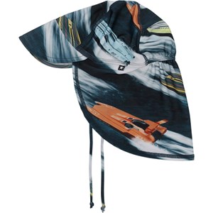 Zonnehoed met 50+ UV-bescherming, een brede rand en langer aan de achterkant voor bescherming tegen de zon. De zonnehoed heeft een mooie print van een speedboten die door het water scheuren.