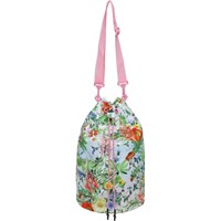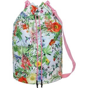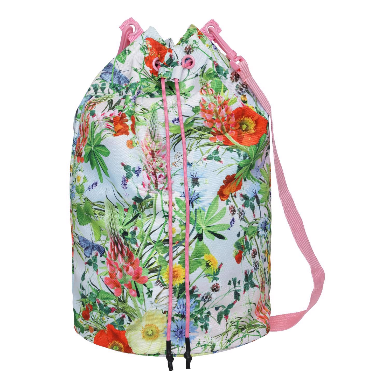 Grote tas met wilde bloemenprint. Het is waterafstotend en heeft koordjes die aan de bovenkant samengetrokken kan worden. Het heeft een schouderband. De tas is perfect voor een uitstapje naar het strand.