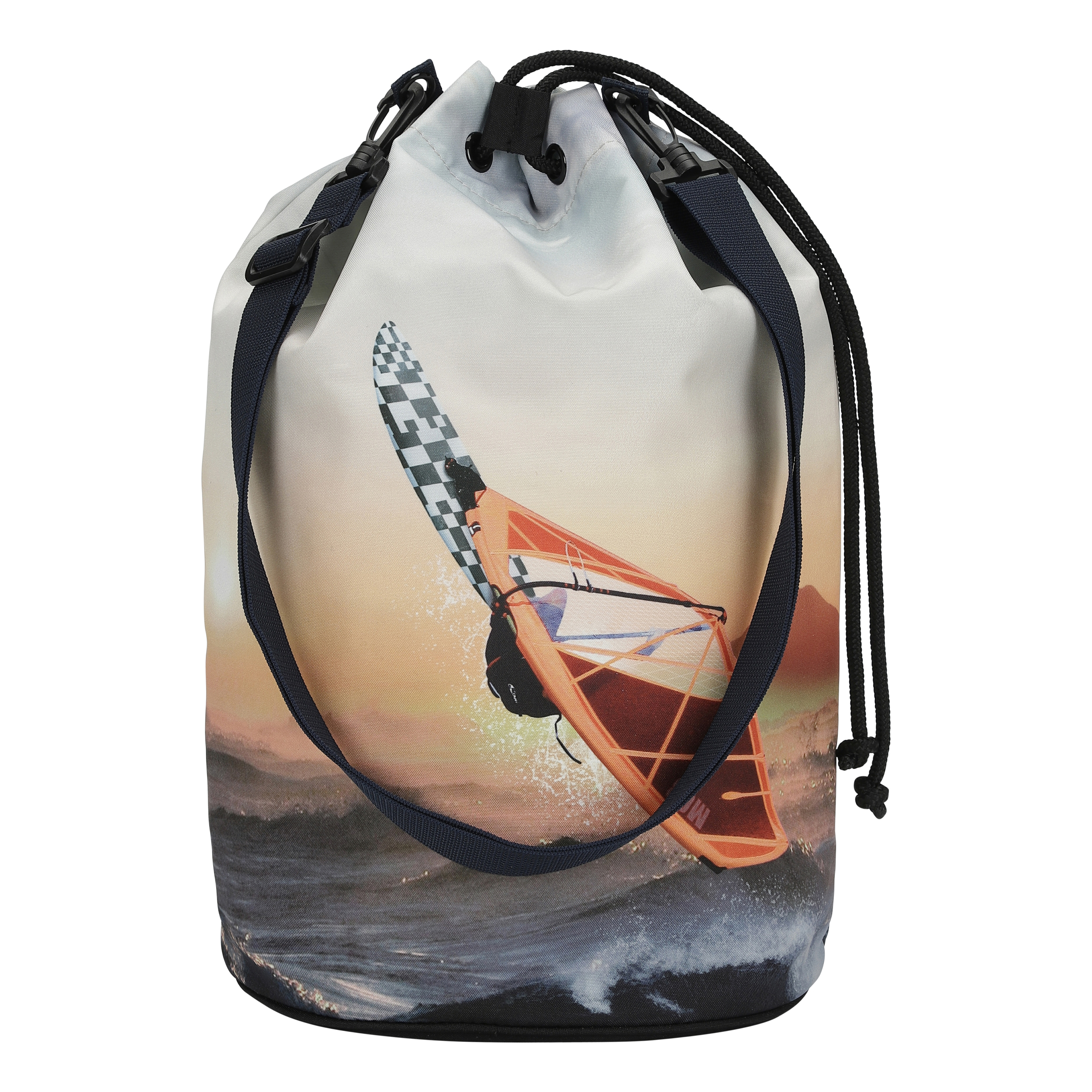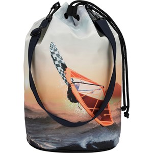 Grote roze strandtas met papegaaiprint. De tas is waterbestendig en heeft een trekkoordsluiting aan de bovenkant die aan elkaar kan worden getrokken, en een schouderriem. De tas is perfect voor een dag op het strand.
