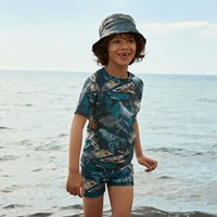 Bucket hat met brede rand en een UV-bescherming van 50+, die een kind beschermt tegen de zon. De bucket hat is een onmisbaar zomeraccessoire en tilt elke outfit naar een hoger niveau. Deze hoed heeft een haaienprint.