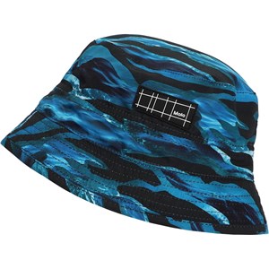 Bucket hat met een smalle rand en 50+ UV berscherming om het kind in de zon te beschermen. De hoed is een onmisbaar zomer accessoire en vrolijkt elke outfit op met zijn blauwe golven print dat lijkt op camouflage. Dit Molo-product is gerecycled en gemaakt van recyclebaar REPREVE polyester. REPREVE is het leidende en meest erkende materiaal in recyclebare vezels en wordt geproduceerd uit gebruikte plastic flessen en ander restafval De productie van gerecycled polyester vereist veel minder grondstoffen en stoot minder CO2 uit, daarom is Molo's gerecyclede zwemkleding de duurzame keuze.