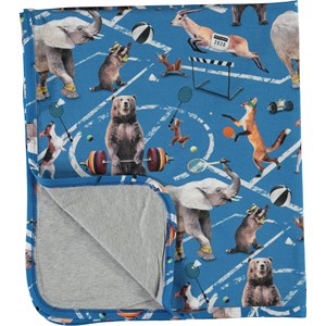 Zacht gevoerde katoenen deken in lichtblauw met een print van verschillende dieren die sporten. De achterkant van de deken is grijs.