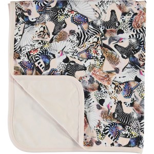 Zacht gevoerde katoenen deken met een print van verschillende dieren die samen een cool patroon vormen. De achterkant van de deken is zachtroze.
