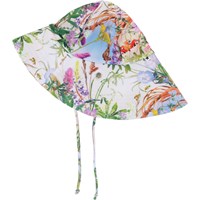 Lichtblauwe zonnehoedje voor kleine kinderen met een roze bloemenprint. Het is gemaakt van 85% gerecycled polyester. De hoed heeft koordjes voor onder de kin, 50+ UV-bescherming en het is in de nek iets langer voor optimale bescherming tegen de zon.