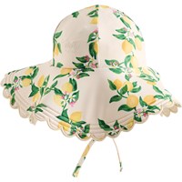 Rekbare zonnehoed in geel met citrusprint voor de kleintjes. De zonnehoed is gemaakt van gerecycled polyester met UV-bescherming 50+, heeft een normale pasvorm, een smal elastisch koord onder de kin en een brede rand die beschermt tegen de zonnestralen.