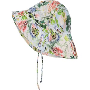 Zonnehoed met 50+ UV bescherming, een brede rand en langer aan de achterkant om het kind optimaal te beschermen. De zonnehoed is lichtblauw met een bloemenprint.
