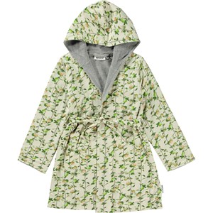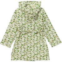 Wave is een zachte badjas in lichtgeel met de Apple Grey print die takken met appels laten zien. De badjas is gevoerd in een grijze lichtgewicht en strak geweven zachte badstof kwaliteit . Het heeft twee zakken, een ceintuur in de taille en een grote capuchon om de nek en het hoofd warm te houden.