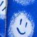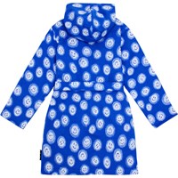 Blauwe zachte badjas van biologische katoenen badstof met een witte smileyprint. Het heeft een grijze voering, twee zakken, een tailleband en een capuchon.