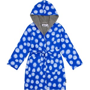 Blauwe zachte badjas van biologische katoenen badstof met een witte smileyprint. Het heeft een grijze voering, twee zakken, een tailleband en een capuchon.