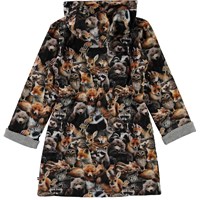 Zachte badjas met een print van bosdieren. Het is gevoerd met een zachte lichtgewicht badstof en heeft twee zakken, koordjes in de taille en een grote capuchon om het hoofd en de nek extra warm te houden.