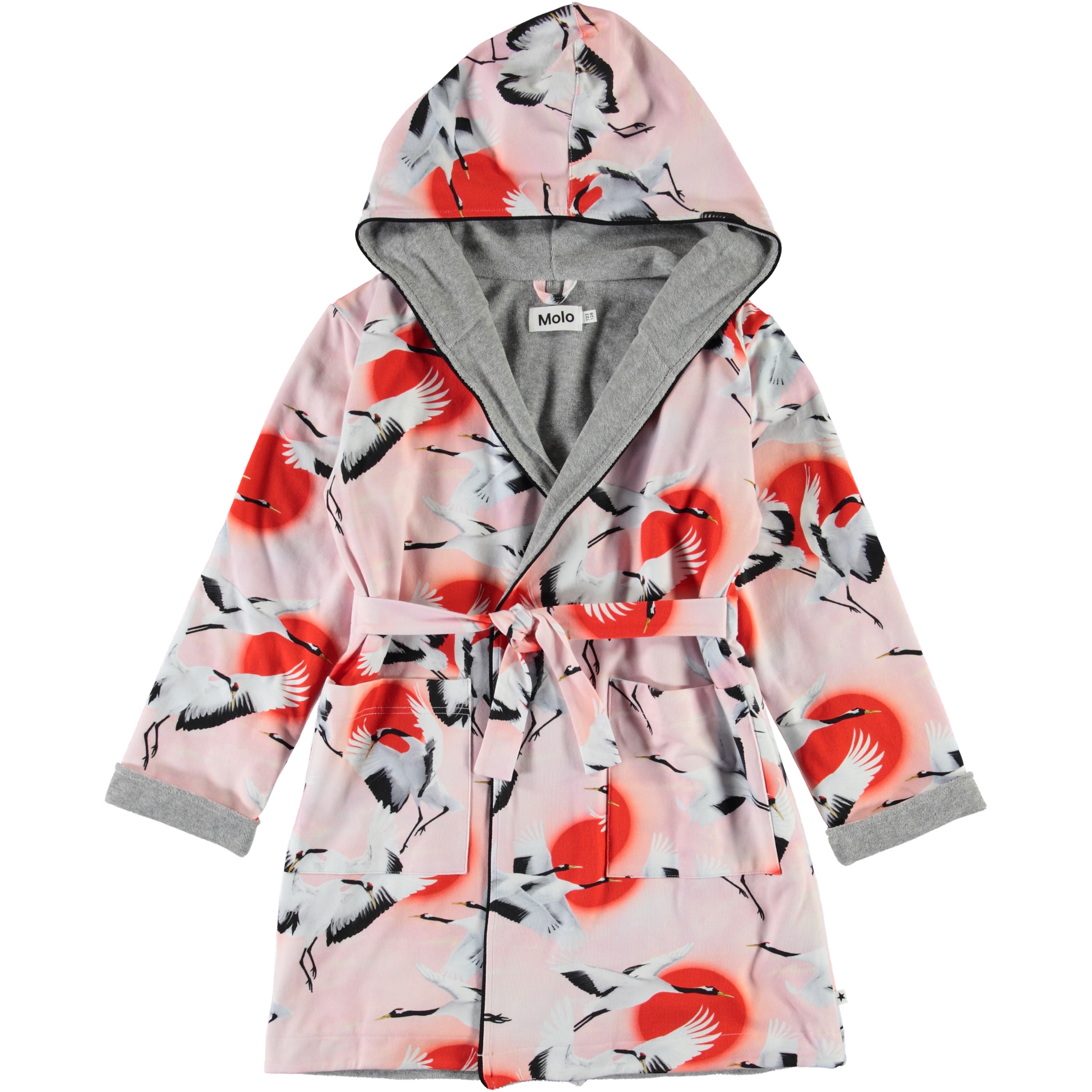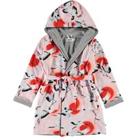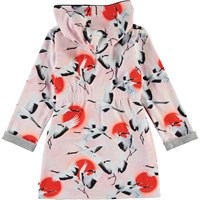 Zachte roze badjas met een print van vliegende kraanvogels. De badjas is gevoerd met zacht lichtgewicht badstof. Het heeft twee zakken, banden in de taille en een grote capuchon om de nek en het hoofd extra warm te houden.
