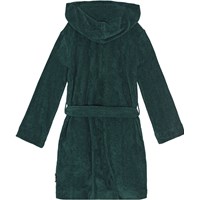 Donkergroene badjas gemaakt van superzacht, biologisch katoenen badstof. De badjas heeft twee zakken, een tailleband en een capuchon.