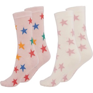 Twee paar sokken. Een paar is in het wit met roze intarsia sterren. Het andere paar is roze met veelkleurige sterren.