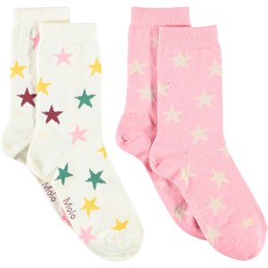 Twee paar sokken. Het ene paar is wit met veelkleurige intarsia sterren, terwijl het andere een roze gekleurd paar is met licht gekleurde sterren.