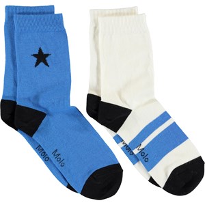 Twee paar sokken in wit en blauw. Eén paar is blauw en heeft intarsia sterren. Het andere paar is wit met blauwe strepen.