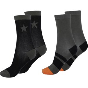 Twee paar sokken in blauw en grijs. Het ene paar heeft een intarsia-ster en het andere paar is gestreept.