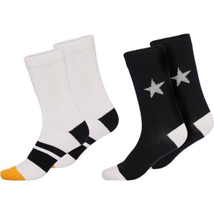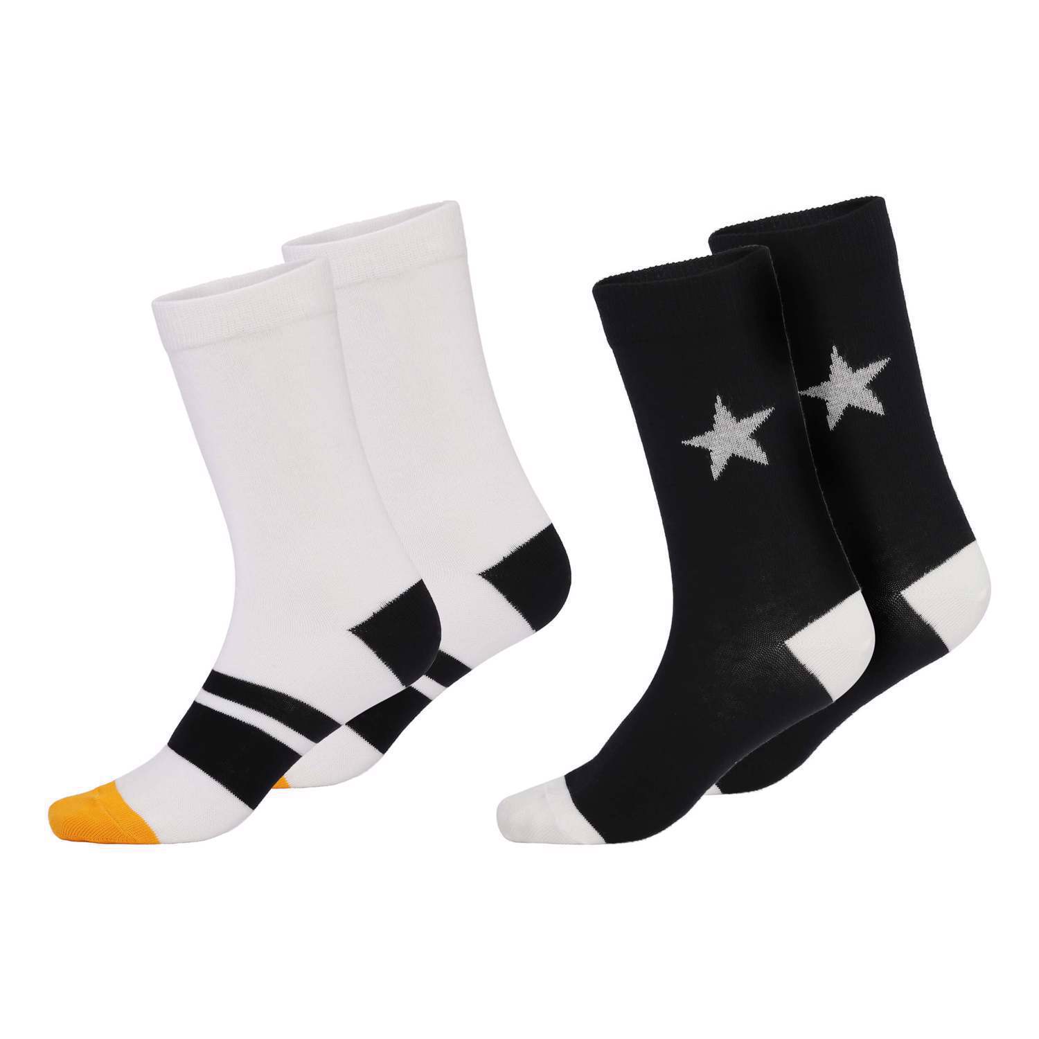 Twee paar sokken. Een paar is wit met gele tenen, heeft een zwarte hiel en strepen over de wreef. Het andere paar is zwart met witte tenen en hiel en grijze sterren rond de enkels.