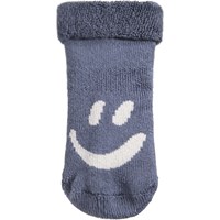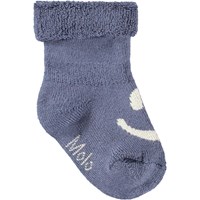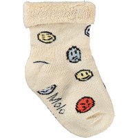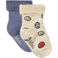 Duo pak babysokken gemaakt van viscose. Het pakket bevat een paar blauwe sokken met een lachend gezicht en een paar crèmekleurige sokken met veelkleurige gezichten.
