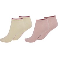 Twee paar enkelsokken in geel en roze met een donkerrode rand.