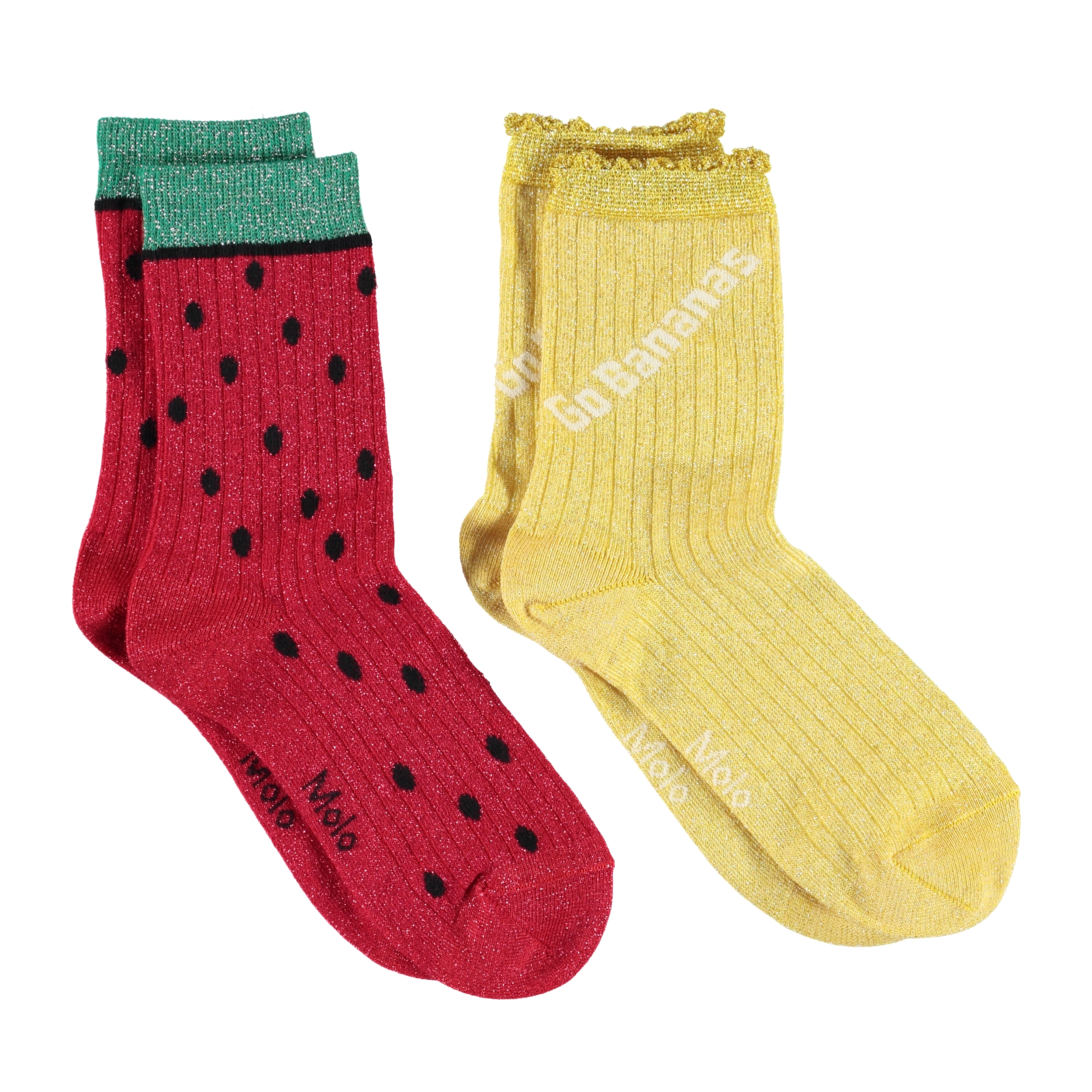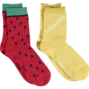 Twee paar op fruit geïnspireerde sokken. Eén paar is geel met een mooie rand en de tekst 'Go Bananas'. Het andere paar ziet eruit als een watermeloen in rood met zwarte stippen en een groene rand.