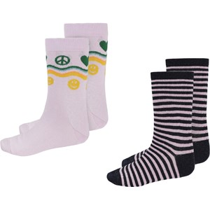 Twee paar sportieve rib sokken. Eén paar is lichtpaars met een peace teken, hartjes en smileygezichten aan de bovenkant. Het andere paar is gestreept.