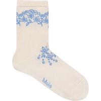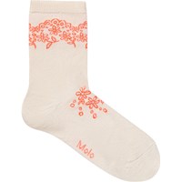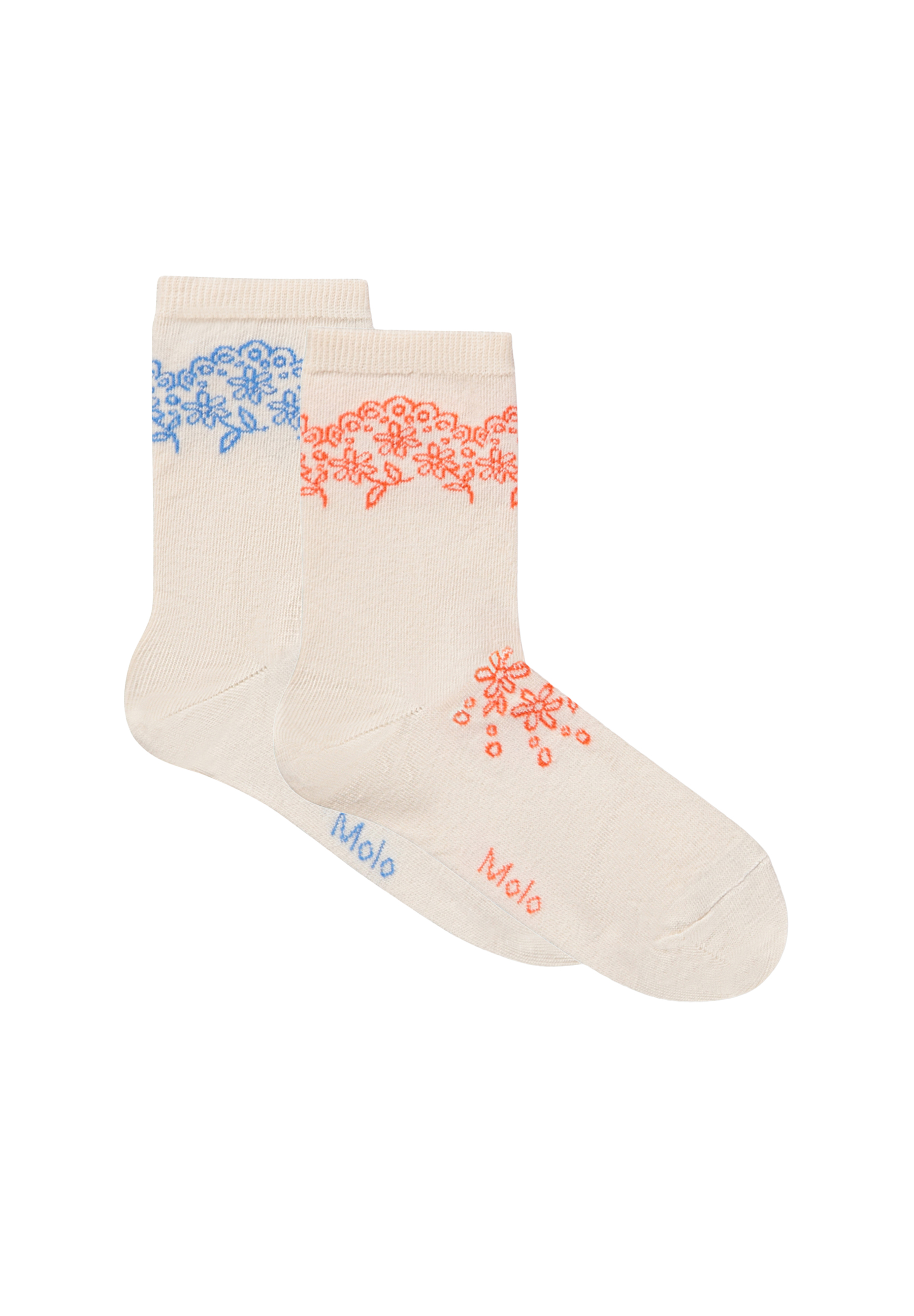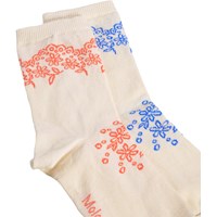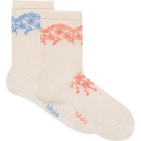 2-pack fijngebreide katoenen sokken met geribde rand aan de bovenkant. De verpakking bevat twee paar crèmekleurige sokken, één met een oranje patroon en één met een blauw patroon.