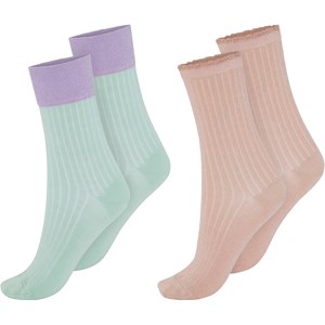 Twee paar sokken in ribstof. Een paar is mintgroen met een lichtpaarse boord en de andere is lichtroze met een prachtige boord.