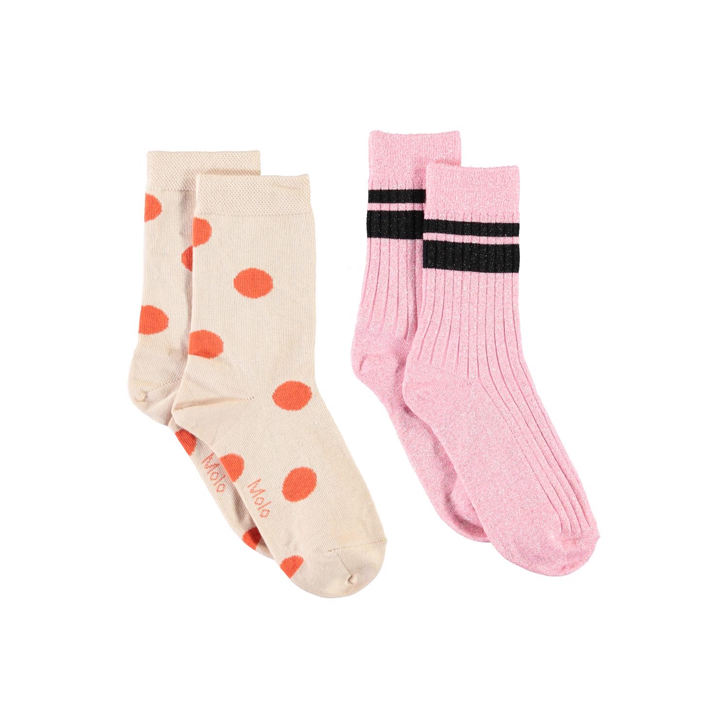 Twee paar sokken. Een paar is in roze rib met zwarte strepen, terwijl de andere roze is met oranje stippen.
