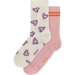Duopak met twee paar sokken van een fijngebreide zachte katoenmix met rib aan de boord en het is elastisch aan de bovenkant. Het pak bevat een wit paar met paarse hartjesprint en een roze paar met glitter met twee oranje strepen aan de bovenkant.