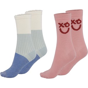 Twee paar lange sokken. Het ene paar is roze met een donkerrode smiley en het andere heeft brede blauwe en witte strepen.