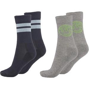 Twee paar sportieve sokken van ribstof. Het ene paar is in het donkerblauw met lichtblauwe strepen en het andere is grijs met een print van de planeet Aarde op beide sokken.