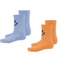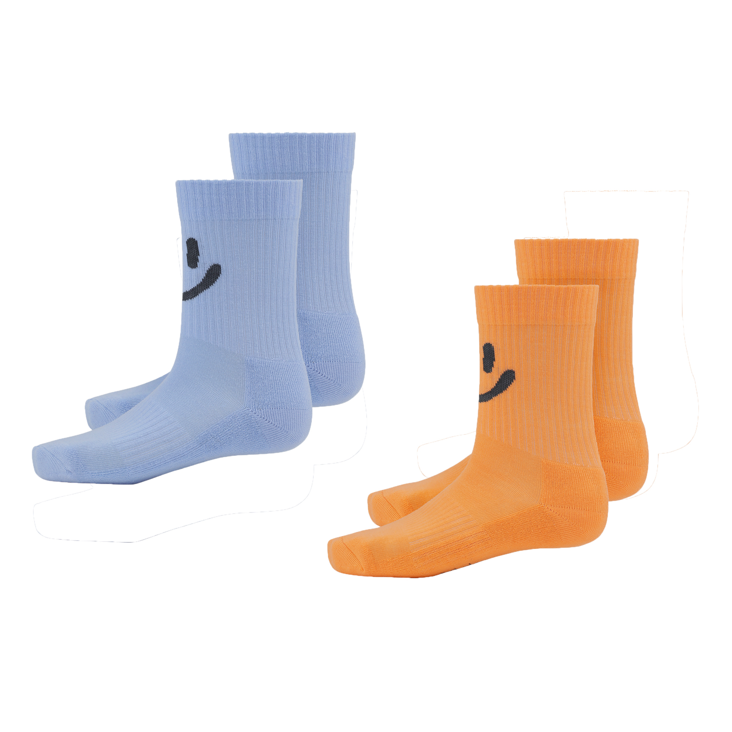 Twee paar sportieve sokken in rib. Eén paar is in lichtblauw met een zwarte smile tag op de voorkant van het been. De andere is in het oranje met hetzelfde label.