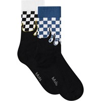 Duopak katoenen sokken. De sokken hebben geribbelde boorden en elastiek aan de bovenkant. Ze zijn heerlijk zacht om te dragen. Het duopak bevat een beige paar met een groen smiley en een paarse paar sokken met een gele smiley.