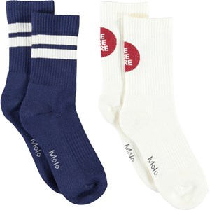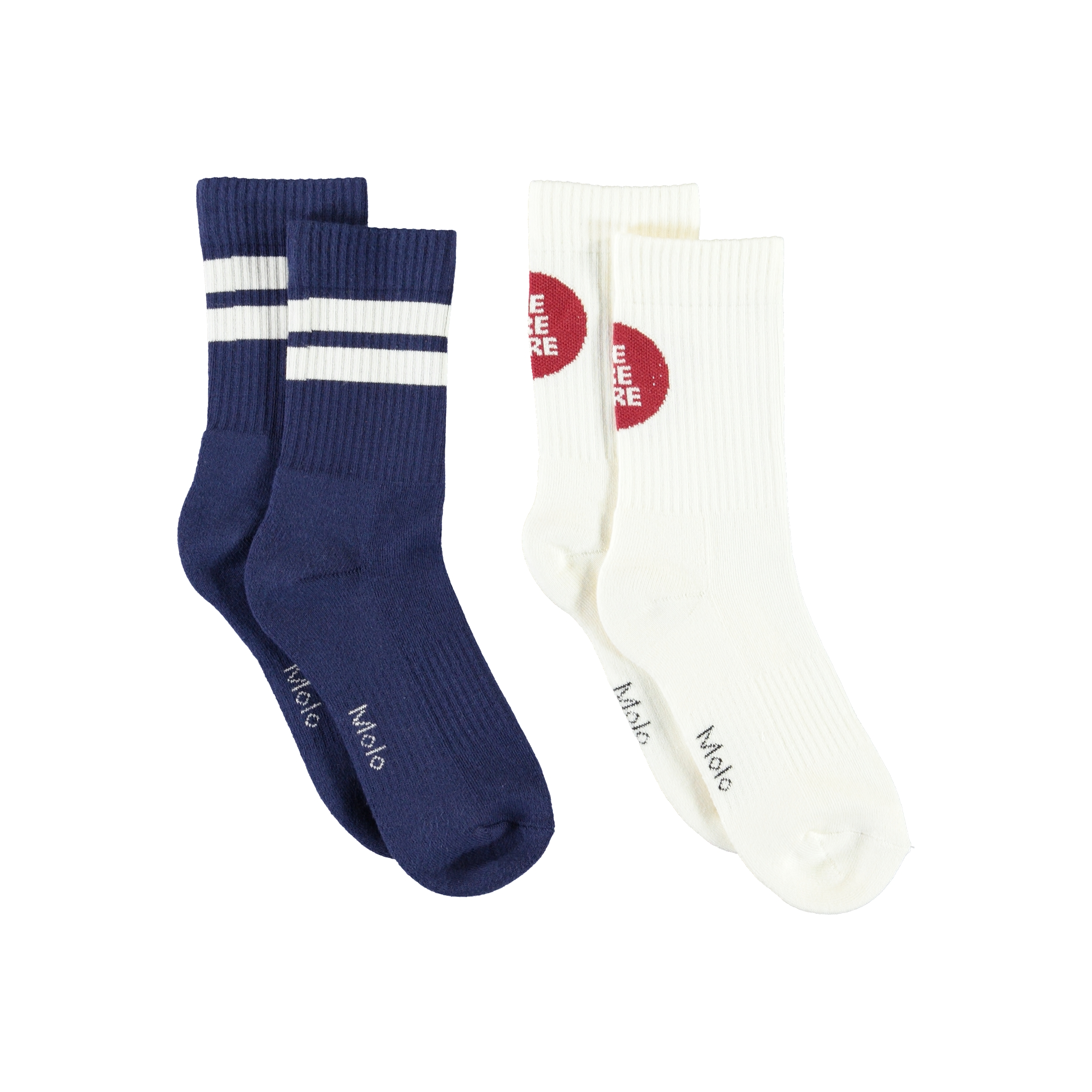 Twee paar of sokken. Het ene paar is wit met een rode cirkel aan de achterkant, terwijl het andere blauw is met witte strepen.