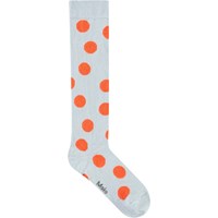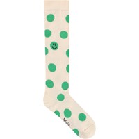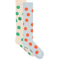 Duopak knielange katoenen sokken. De sokken zijn tot kniehoogte en hebben geribbelde boorden die ervoor zorgen dat ze op hun plaats blijven. Het duopak bevat een paar beige sokken met groene stippen en smileys en een paar lichtblauwe sokken met oranje stippen en smileys.