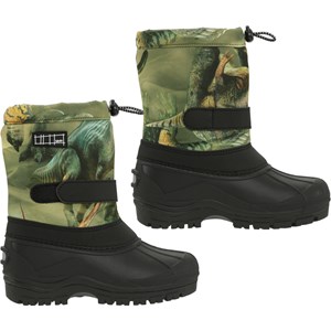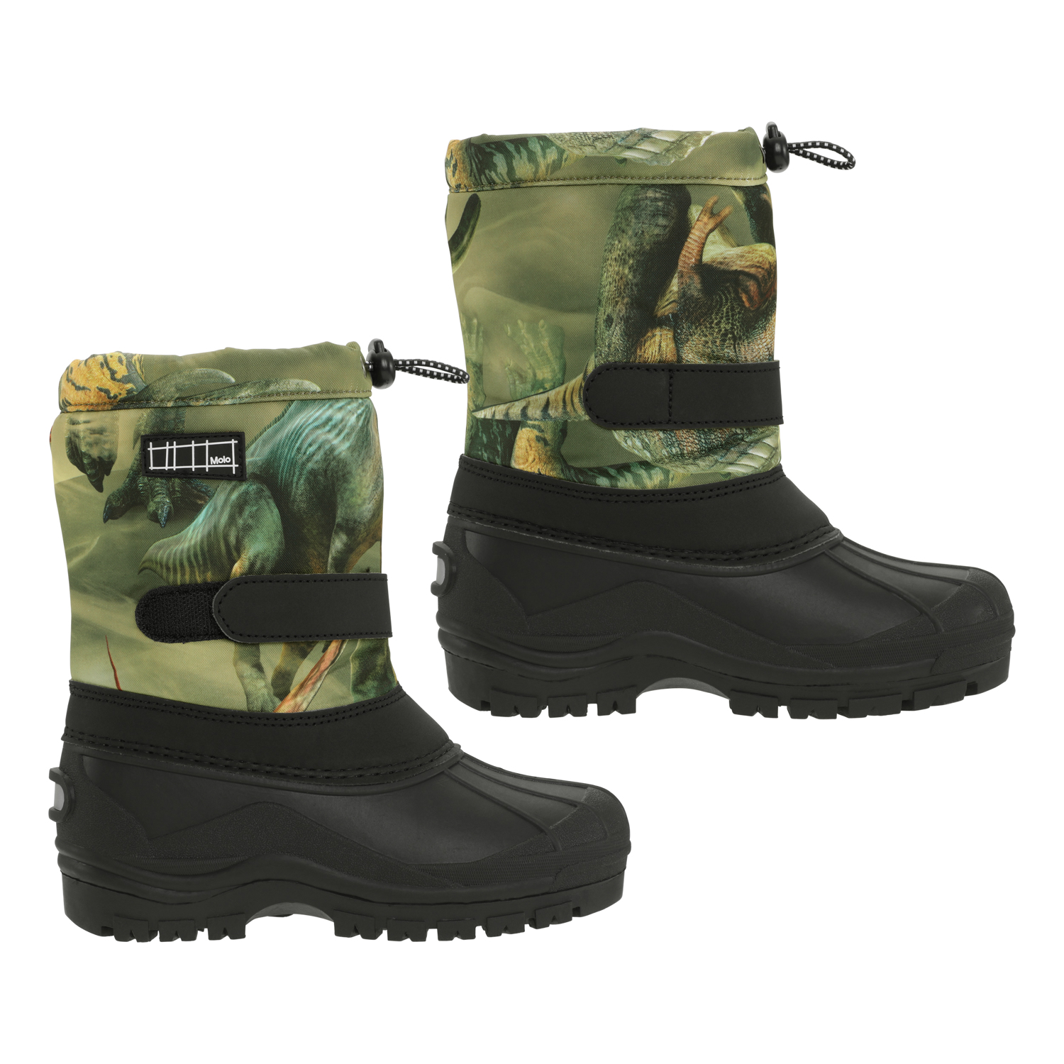 Praktische winterlaarzen in het groen met een dinosaurus print en met grove, zwarte zolen. De laarzen zijn vrij lang en geschikt voor alle weersomstandigheden. Deze laarzen passen bij de prints en kleuren van Molo's buitenkleding.