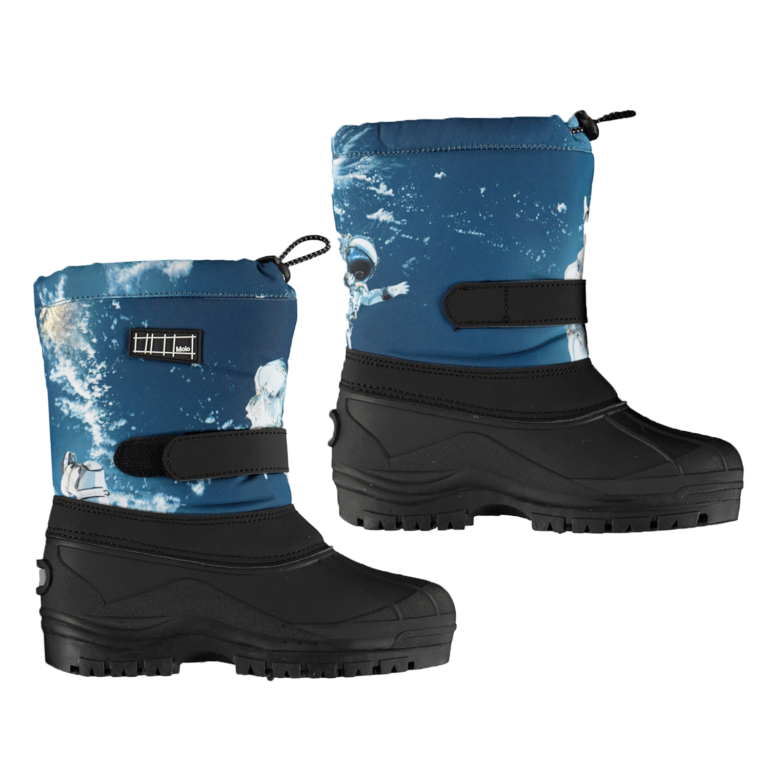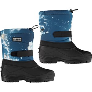Blauwe winterlaarzen met een astronautenprint. De laarzen zijn gemaakt van functioneel polyester met een verstelbare sluiting bij de schacht en een zachte rubberen zool die doorloopt rond de voet. Het buitenmateriaal van de laarzen is voor 35% gerecycled en gemaakt van gerecycled polyester. Zowel de zool als de schacht zijn waterdicht. Ze hebben een dikke binnensok van polyester, waardoor de laarzen perfect zijn voor zowel warmer als kouder weer. Dit product heeft een waterbestendige, PFC-vrije oppervlaktebehandeling (Bevat bijvoorbeeld geen PFOS, PFOA, etc). Waterkolomdruk: 10.000 mm. Ademend: 8.000 g/m2/24u.
