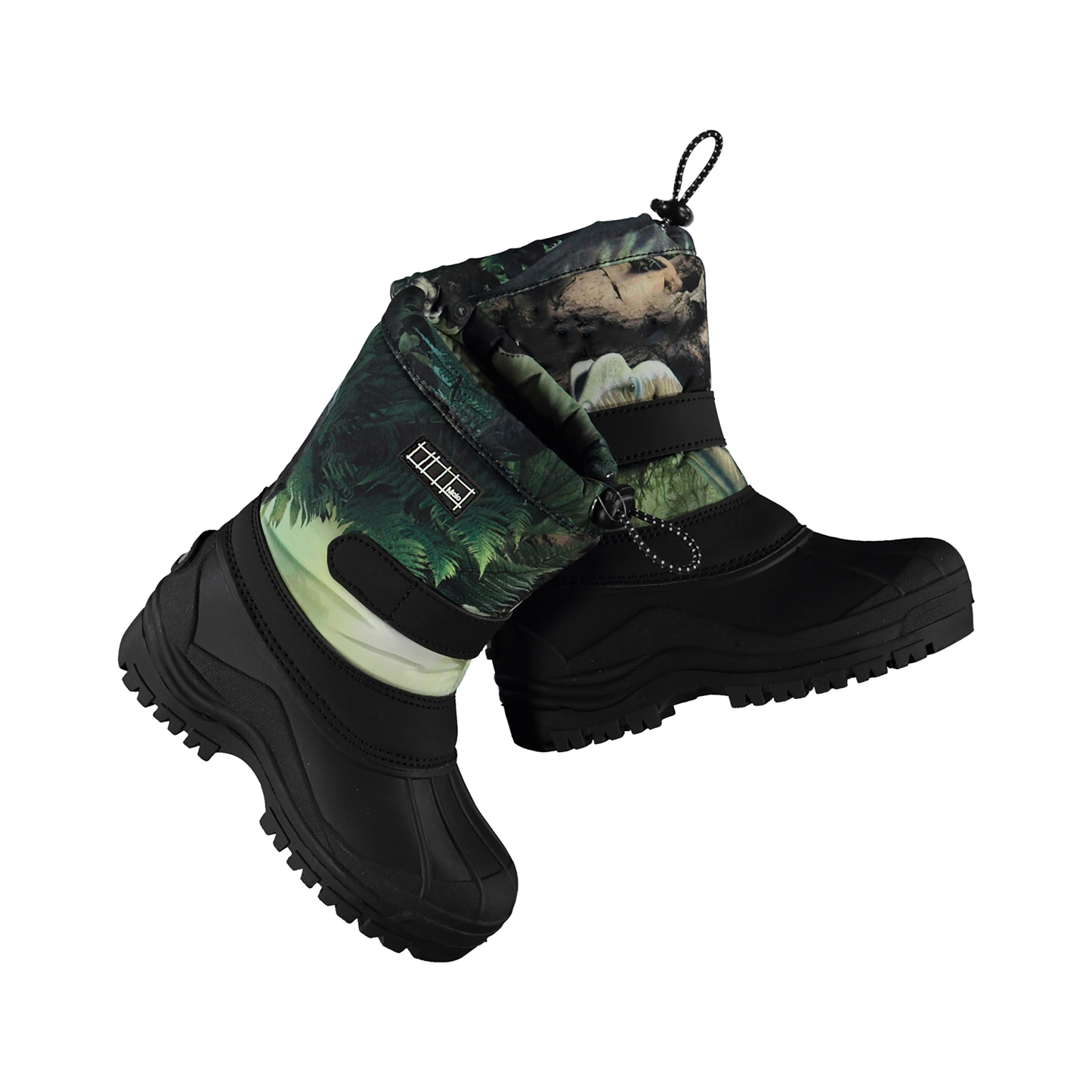 Groene winterlaarzen met een dinosaurusprint. De laarzen zijn gemaakt van functioneel polyester met een verstelbare sluiting bij de schacht en een zachte rubberen zool die doorloopt rond de voet. Het buitenmateriaal van de laarzen is voor 35% gerecycled en gemaakt van gerecycled polyester. Zowel de zool als de schacht zijn waterdicht. Ze hebben een dikke binnensok van polyester, waardoor de laarzen perfect zijn voor zowel warmer als kouder weer. Dit product heeft een waterbestendige, PFC-vrije oppervlaktebehandeling (Bevat bijvoorbeeld geen PFOS, PFOA, etc). Waterkolomdruk: 10.000 mm. Ademend: 8.000 g/m2/24u.
