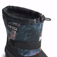 Praktische winterlaarzen met een stevige en antislip zwarte zool en een print van dinosaurussen in tinten blauw, groen en bruin. De laarzen hebben een verstelbare elastiek aan de bovenkant van de schacht, verstelbare klittenband rond de enkel, een binnenste sok en een goede hoogte, waardoor ze geschikt zijn voor alle soorten weer.