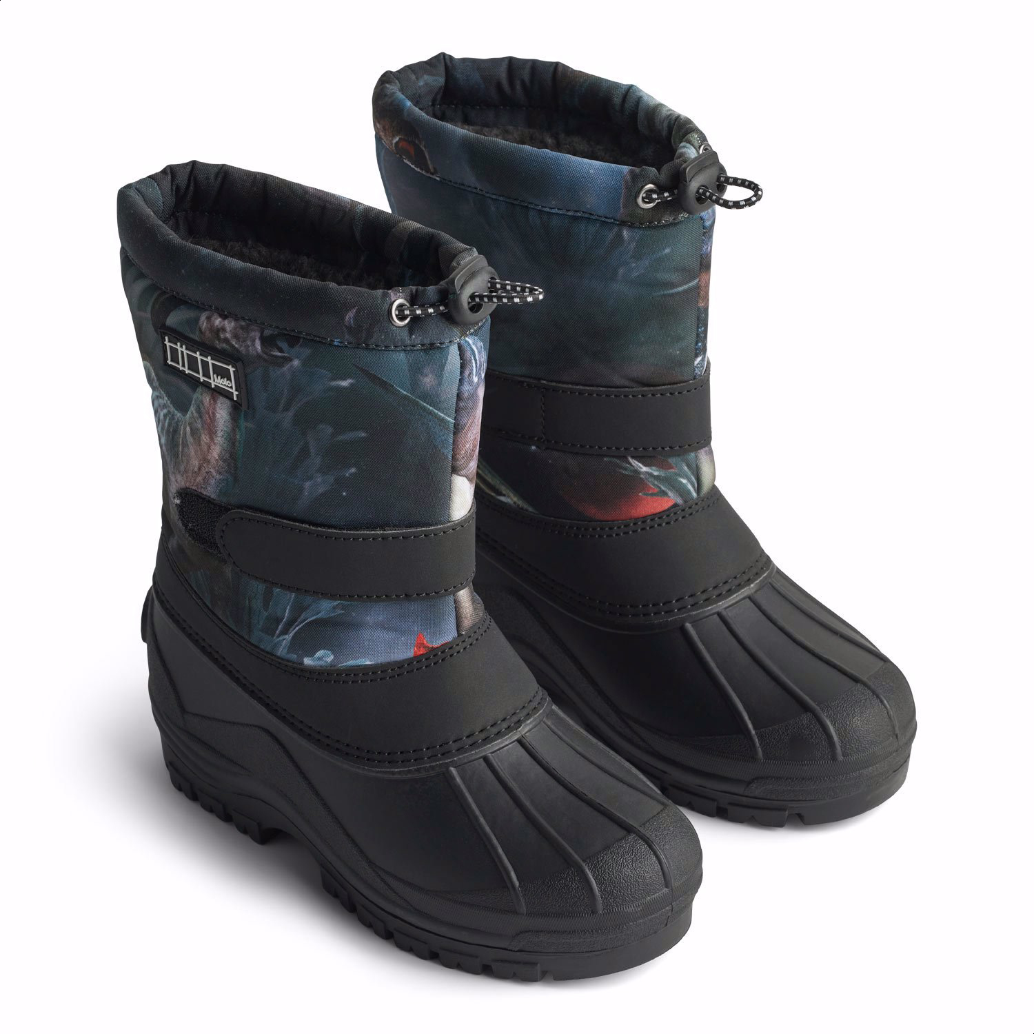 Praktische winterlaarzen met een stevige en antislip zwarte zool en een print van dinosaurussen in tinten blauw, groen en bruin. De laarzen hebben een verstelbare elastiek aan de bovenkant van de schacht, verstelbare klittenband rond de enkel, een binnenste sok en een goede hoogte, waardoor ze geschikt zijn voor alle soorten weer.