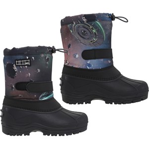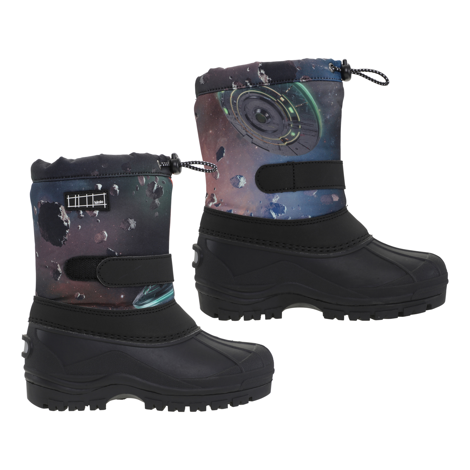Praktische winterlaarzen met een print van planeten en ruimteschepen met grove, zwarte zolen. De laarzen zijn vrij lang en geschikt voor alle weersomstandigheden. Deze laarzen passen bij de prints en kleuren van Molo's buitenkleding.