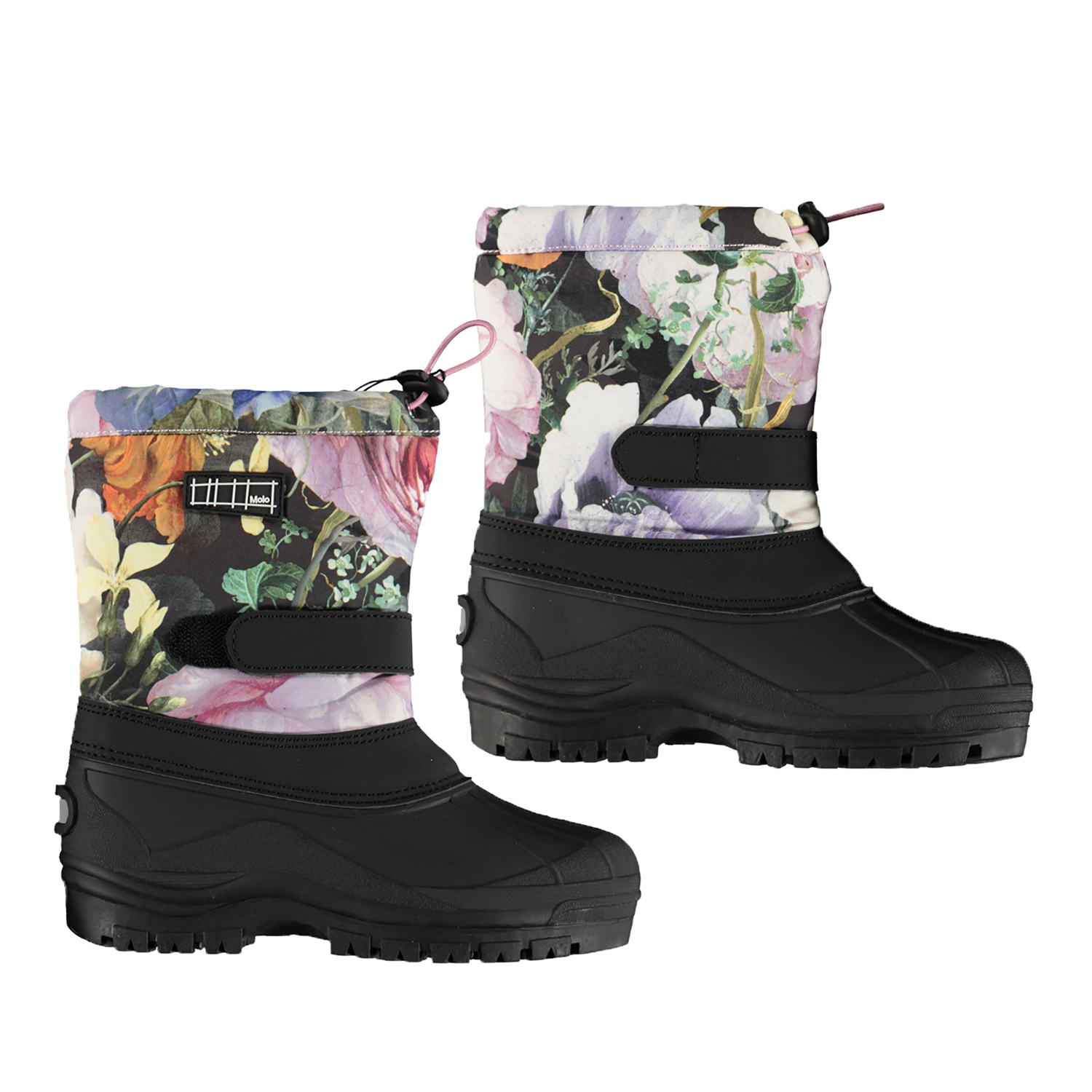 Winterlaarzen met een bloemenprint. De laarzen zijn gemaakt van functioneel polyester met een verstelbare sluiting bij de schacht en een zachte rubberen zool die doorloopt rond de voet. Het buitenmateriaal van de laarzen is voor 35% gerecycled en gemaakt van gerecycled polyester. Zowel de zool als de schacht zijn waterdicht. Ze hebben een dikke binnensok van polyester, waardoor de laarzen perfect zijn voor zowel warmer als kouder weer. Dit product heeft een waterbestendige, PFC-vrije oppervlaktebehandeling (Bevat bijvoorbeeld geen PFOS, PFOA, etc). Waterkolomdruk: 10.000 mm. Ademend: 8.000 g/m2/24u.