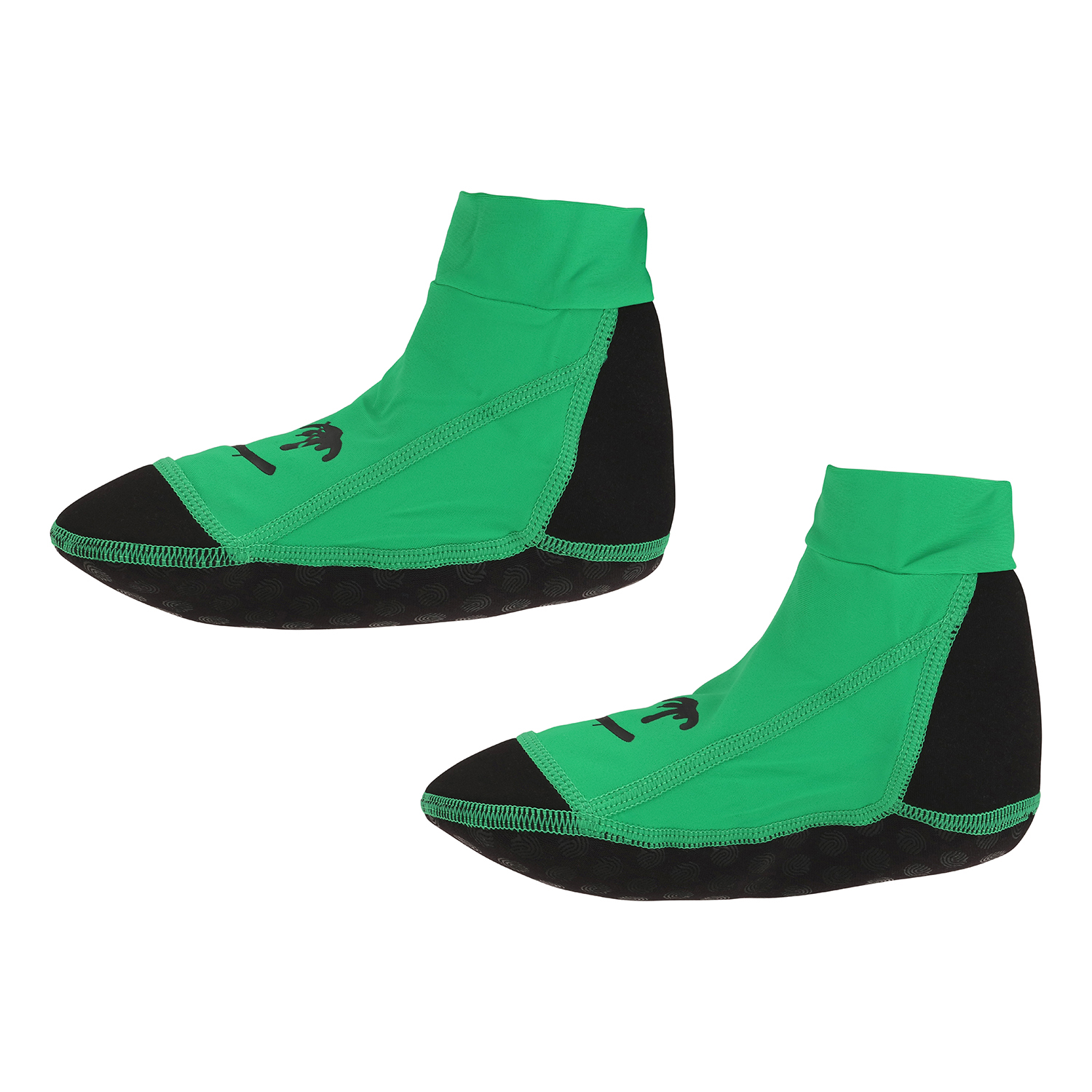 Groene en zwarte watersokken met op de bovenkant een print van een emoji met ogen van palmbomen. Ze beschermen kleine voetjes tegen scherpe voorwerpen en warm zand. De sokken zijn gemaakt van gerecycled rekbaar polyester, waardoor ze gemakkelijk aan en uit te trekken zijn. Molo's zwemkleding heeft een hoog niveau 50+ UV-bescherming.